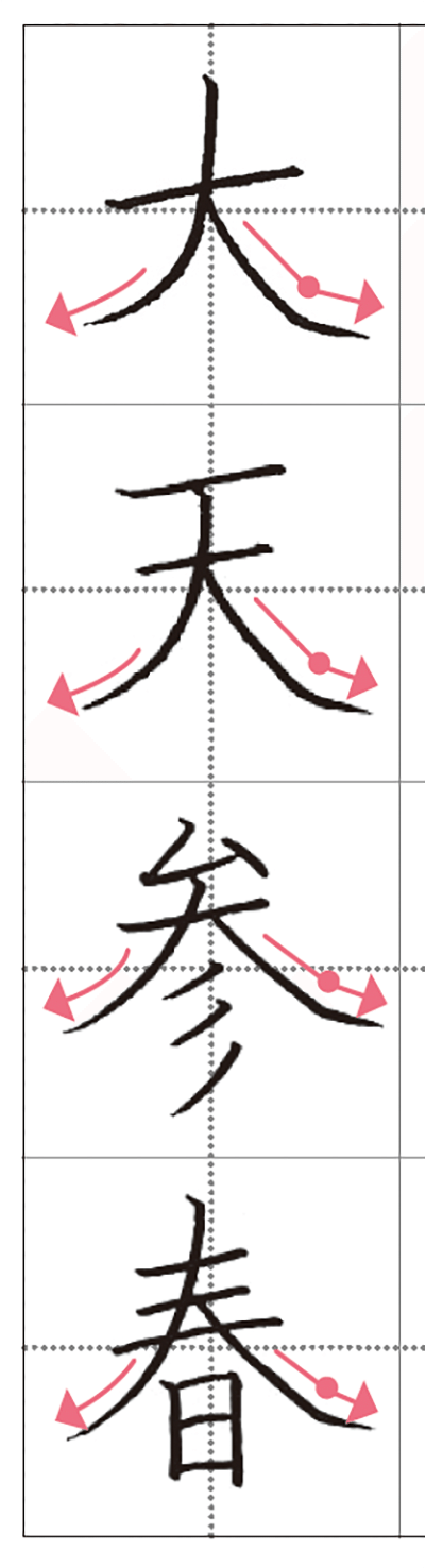 「大」「天」などのように、左右に払いがある漢字は、横線よりも外に広げて〝末広がり〟のイメージで書きましょう。