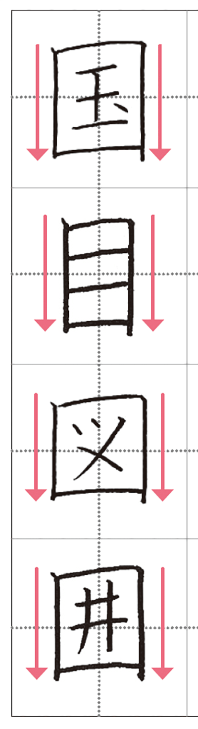 このうち、「国」「目」などの縦長囲みの漢字は、両側の縦線をまっすぐおろすと、字形が安定して、大人っぽくまとまります。