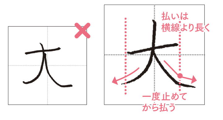 「大」は左右の払いが横線より短いと、幼い印象に。
