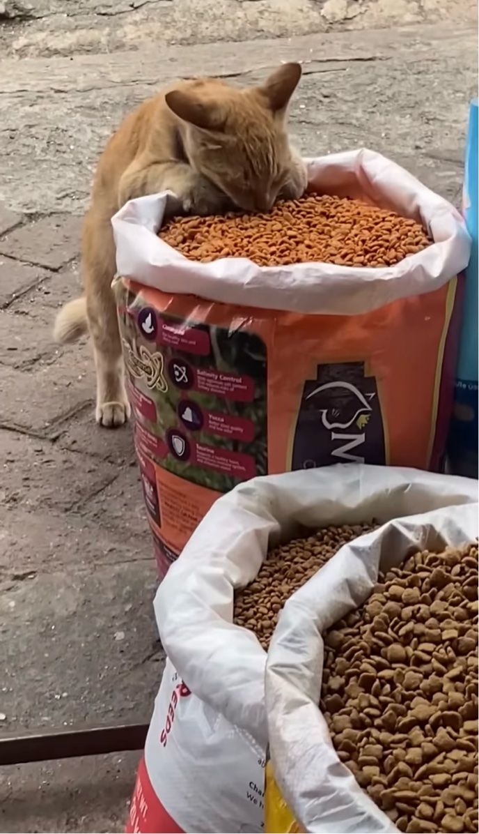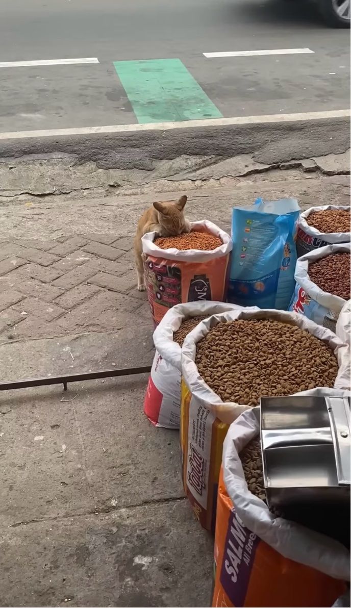 3. 食べ放題会場?屋台に並ぶ売り物のペットフードをネコが堂々とつまみ食い!?【海外・動画】