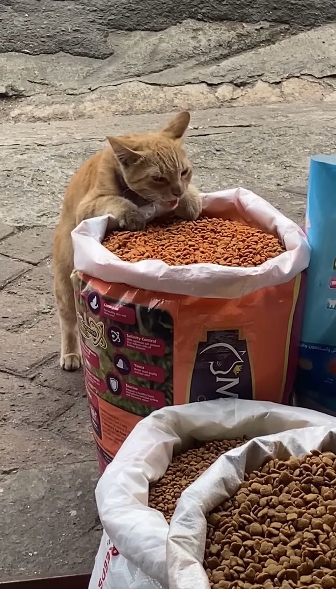 愛猫のためにキャットフードを購入しようと、その屋台に立ち寄った撮影者さん。 すると驚いたことに、商品のペットフードを堂々とつまみ食いしている子がいたのです!