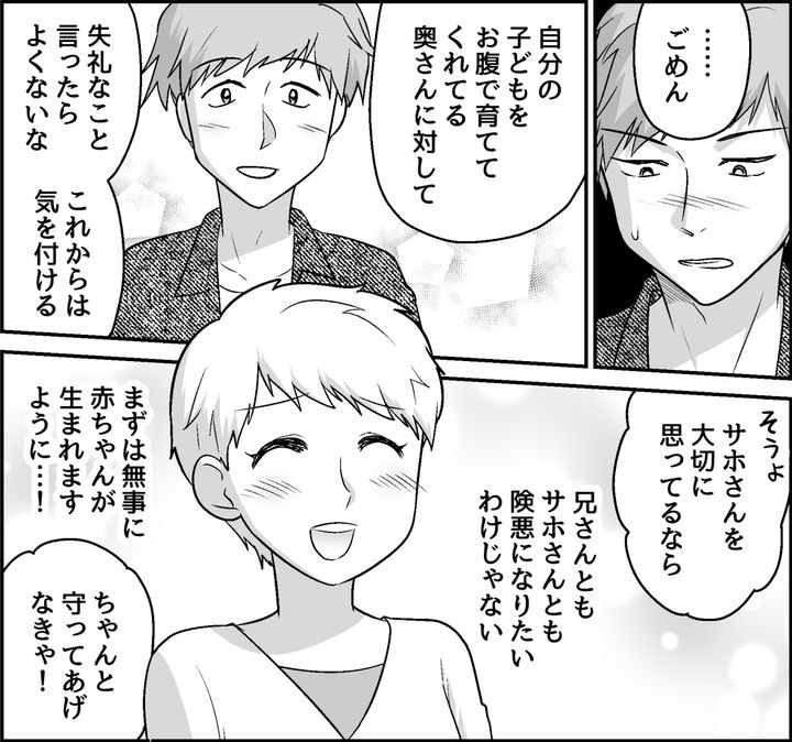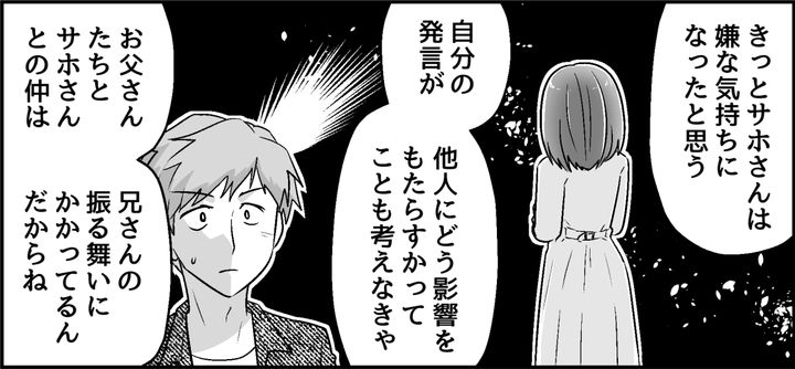 両親とサホさんとの仲だって、間に立つ兄にかかっているのです。自分の発言が他人にどう影響するか考えてほしいと諭すと、兄はようやく理解してくれました。自分の言動で関係がこじれてしまったことを、しっかり心に留めてほしいと思います。