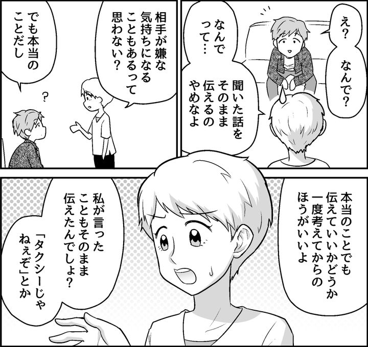 サホさんが激怒した様子を、無神経にそのまま話してきた兄。聞いたほうが不快になるなんて、ちっとも考えていなかったようです。この調子なら私の発言も、おそらくそのままサホさんに伝えたのでしょう。「お父さんはタクシーじゃない」とか「実家はホテルじゃない」とか……。兄にとっては軽い言葉でも、サホさんは重く受け止めるはず。