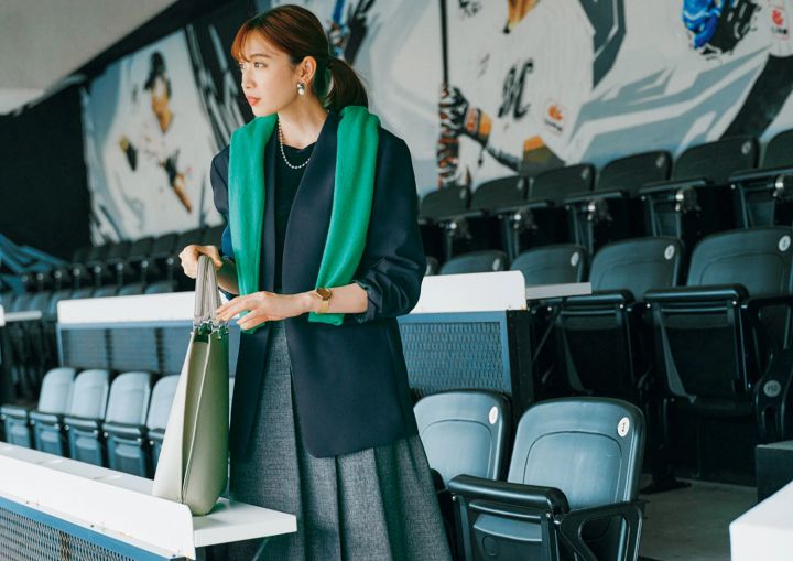 上役の方にもご挨拶する日は、JK×プリーツスカートでトラッドを意識。鮮やかな緑が映えるグリーンのニットは肩掛けしてアクセ感覚で楽しんで。
