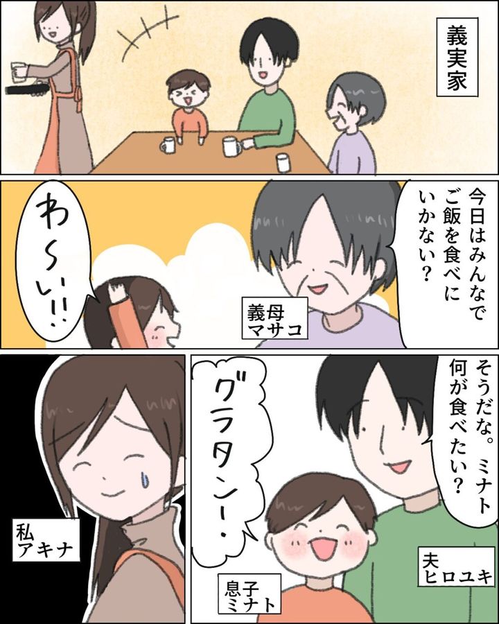 私はアキナ。今日は家族で義実家に遊びに来ています。お昼ご飯の時間が近づいた頃、義母が「今日はみんなでご飯を食べに行かない?」と提案してくれました。息子のミナトは「わ~い!!」と大喜び、夫のヒロユキも「そうだな」と賛成し、「ミナト、何が食べたい?」「グラタン!」と楽しそうに話しています。その様子を笑顔で見つめながらも、実はあまり気乗りしない私。