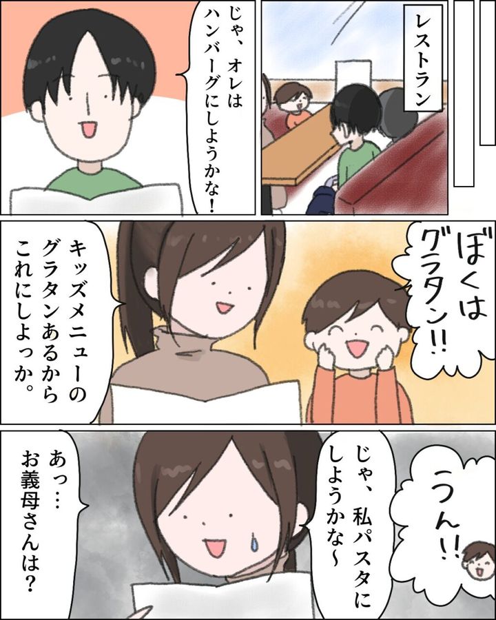 レストランに着くと、「じゃ、オレはハンバーグにしようかな!」とすぐにメニューを決めたヒロユキ。「ぼくはグラタン!!」と言うミナトに「キッズメニューのグラタンあるからこれにしよっか」とミナトのメニューもすぐに決まり、「じゃ、私パスタにしようかな~」と言いながら、「あっ・・お義母さんは?」と声をかけた私。