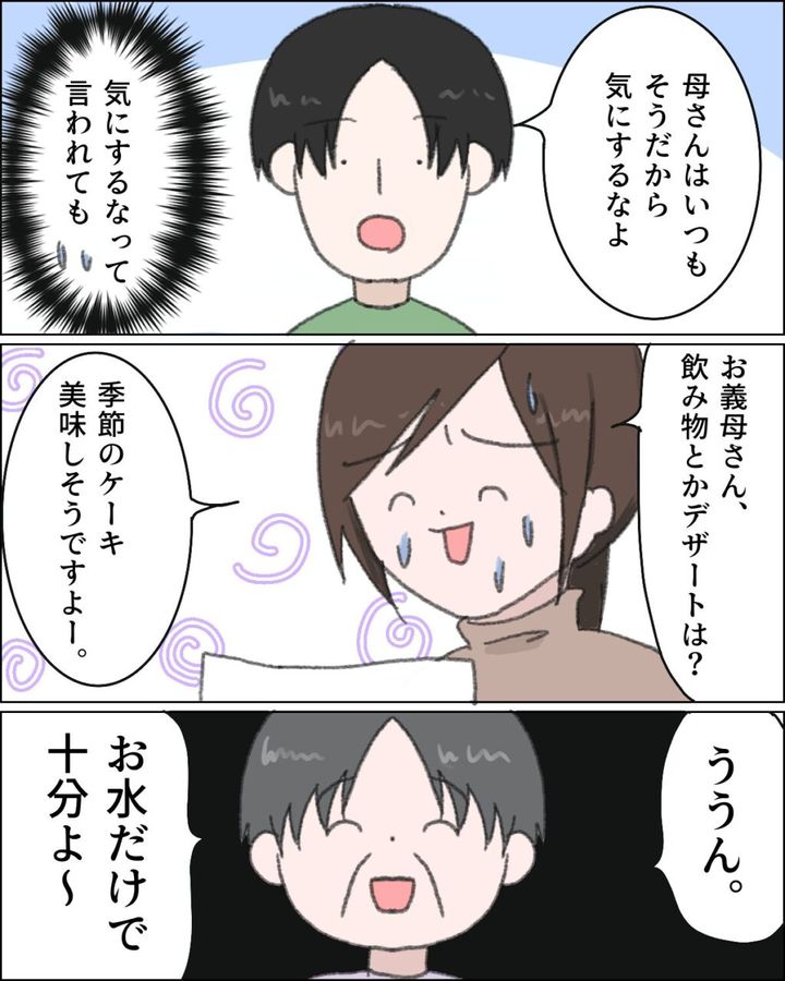 「母さんはいつもそうだから気にするなよ」と言う夫に「気にするなって言われても」と心の中で突っ込みつつ、「お義母さん、飲み物とかデザートは?季節のケーキ美味しそうですよー」とさらに粘ってみる私。しかし、私のささやかな抵抗も虚しく「ううん。お水だけで十分よ~」と義母が微笑みます。ダメだ。通じない。