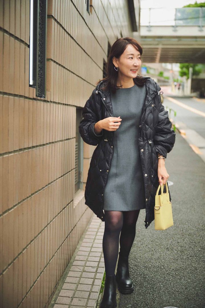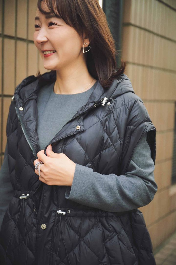 ボリューム感あるダウンは、どうしても着膨れ問題が悩みの種。このダウンはそんな悩みが全くなく、スッキリとしたシルエットで着られて、袖を外してジレとしても使える、ウエストや裾を絞ることも可能なマルチウェイ仕様に一目惚れしました。今年らしいミニ丈のワンピースを合わせてウエストを絞り、ショート丈ブーツで甘めカジュアルに仕上げました。