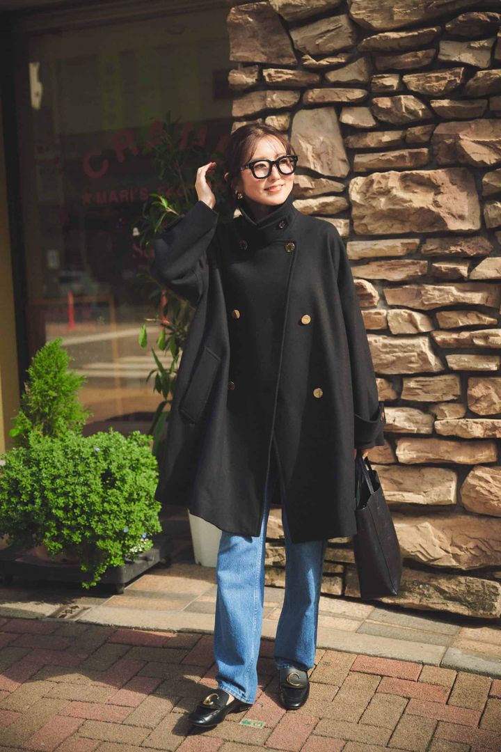 ずっと“欲しいものリスト”にあったマッキントッシュのハンビーコートを今年お迎えしました。長く使えそうなAラインのテント型で、低身長でもバランス良く着られ、地味になり過ぎない金ボタンがトラッドな雰囲気で気に入っています。コートが主役になるように敢えてシンプルにしたく、ニット×デニムにローファーで合わせました。黒縁メガネで遊びをプラスして、大人のトラッドスタイルに仕上げました。