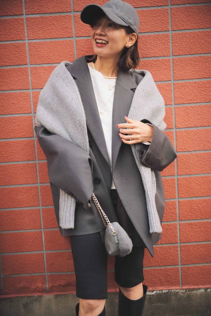 今年はコート感覚で羽織れるジャケットを新調。肩パットが入ったオーバーサイズのシルエットが魅力です。今季トレンドのショート丈のバイカーパンツを合わせ、肩に掛けたセーターで立体感をプラス。秋冬らしさを意識して、ジュエリーやバッグのチェーンはゴールドで統一しました。グレートーンで仕上げるきれいめカジュアルが今の気分です。