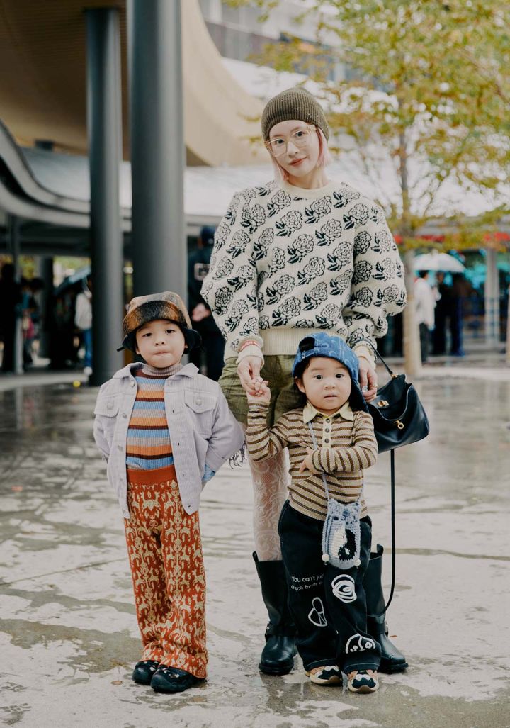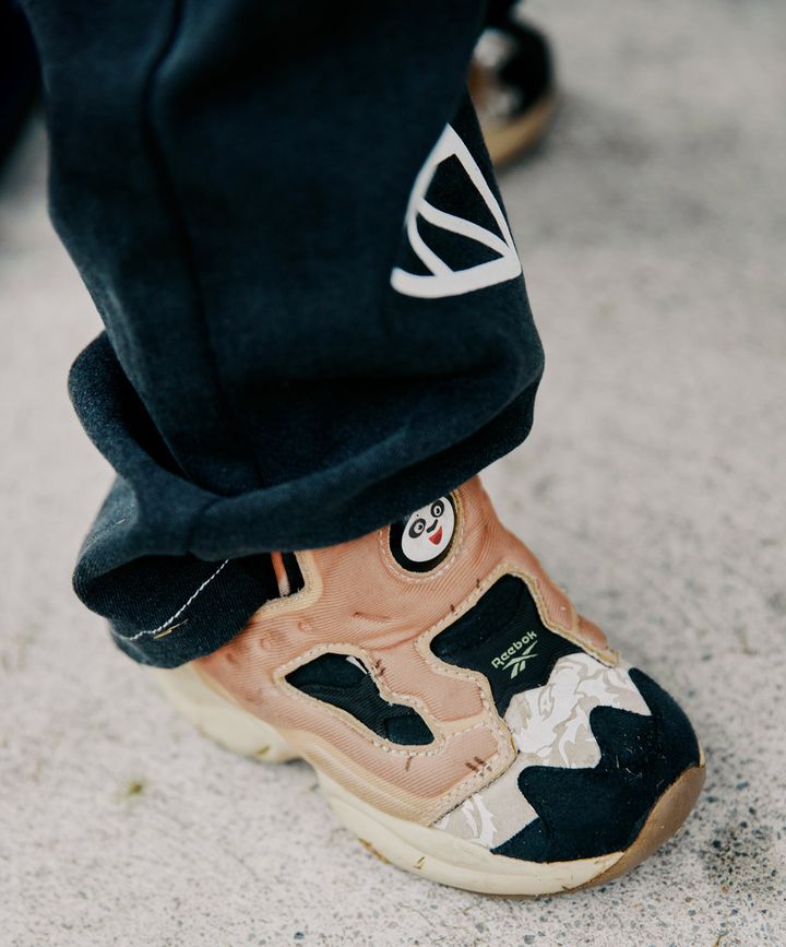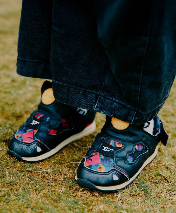 Mom’s Instagram:@kasimegu人気ブランド『リーボック』のポンプフューリーと、あの人気映画『カンフーパンダ』のコラボスニーカーを履きこなすぶんちゃん。トップスにはトレンドのラガーシャツ、ボトムは遊び心のあるプリントデニムを合わせてこなれたムードに。キャップを後ろ向きに被って仕上げれば、チャーミングさも全開! 特別感たっぷりな足元が主役の今どきストリート。kids item>>>misha&puffのトップス、Semon ApartMentのボトムス、Marine Serreのハット、KNIT MAKERのバッグ