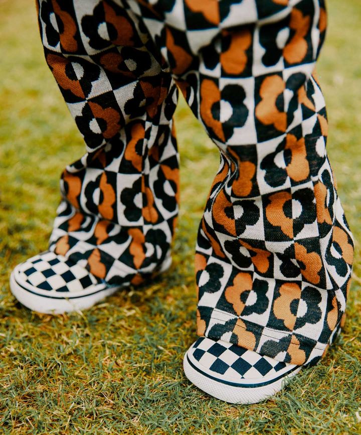Mom’s Instagram:@jamkanchiブルーのスウェットに、ヒッピーな雰囲気が漂うジオメトリック柄のフレアパンツを合わせたスイセンくん。足元には『ヴァンズ』のスリッポンをオン。難しそうに見える柄オン柄のコーデも、カラーを揃えることでまとまりのよい仕上がりに。カラフルなストライプハットが陽気な雰囲気をさらに引き立ててくれる。kids item>>>MARKEY'Sのトップスとボトムス、LOWRYS FARMの帽子