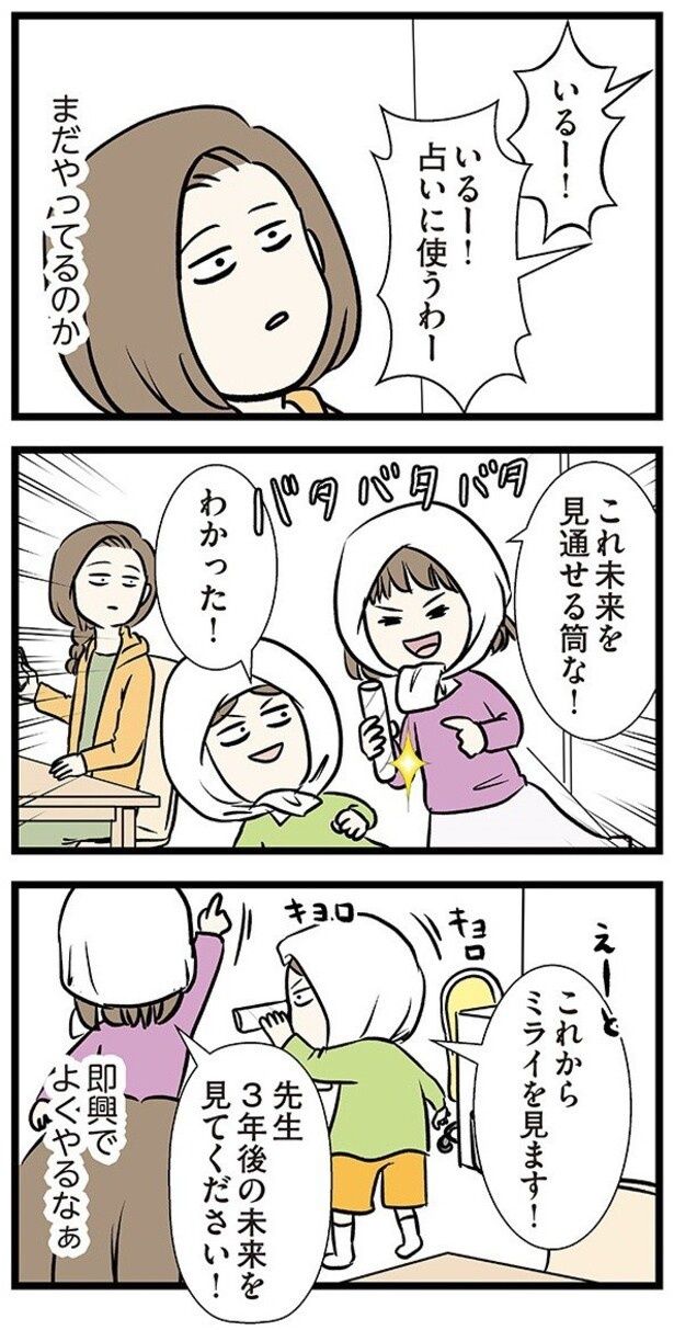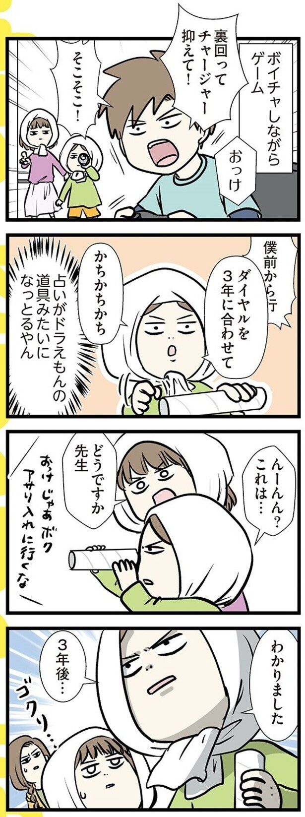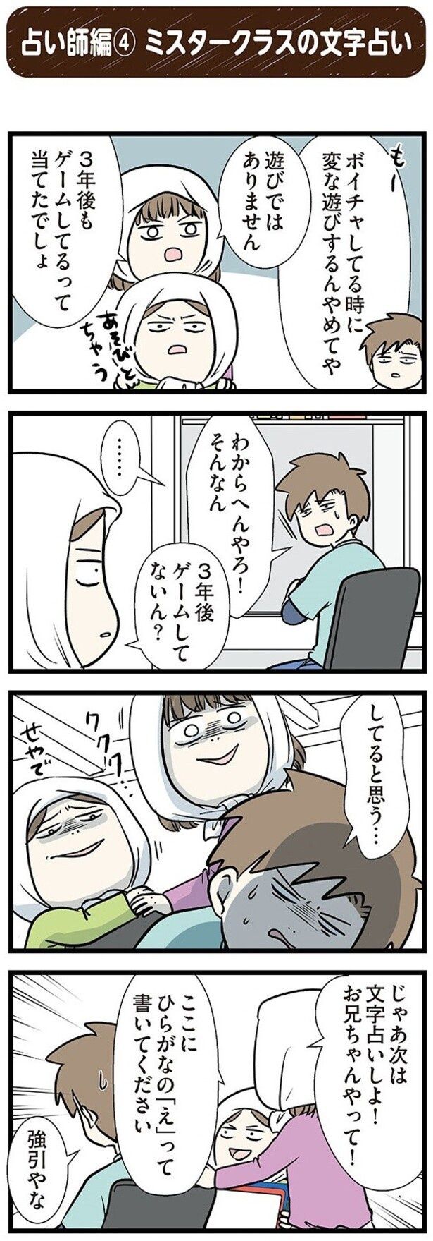 3. 兄に文字占いを強要する末娘。ひらがなから独自に占った結果は?/いくで!小学生エムモトえむみの勝手きままライフ