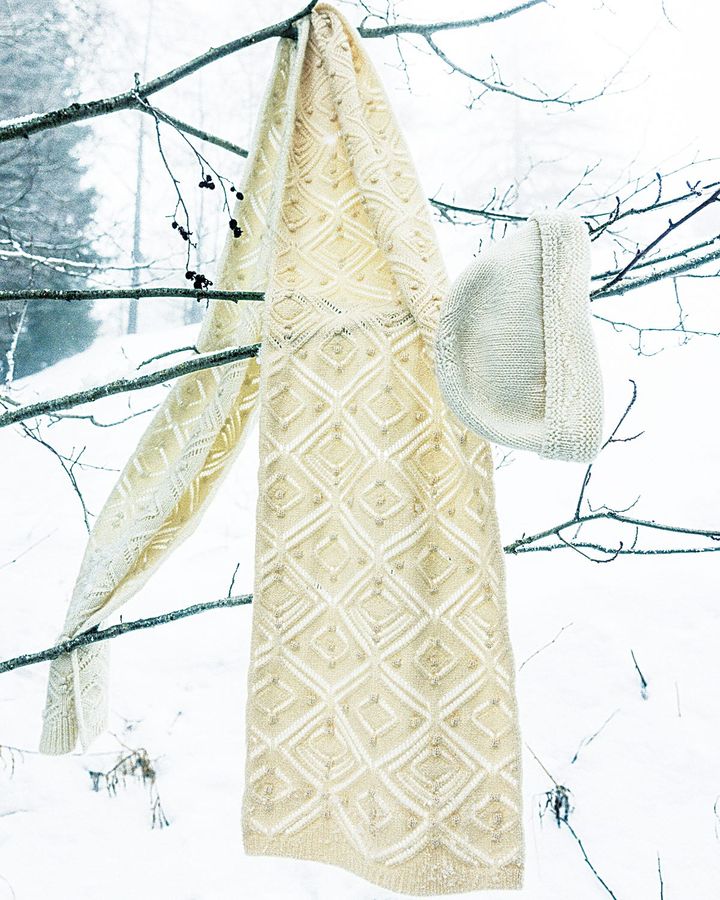 リンクステッチの折り返しがついた、クラシカルなニット帽。帽子¥84,700 異なるステッチを組み合わせることでドットとひし形が立体的に浮かび上がる一枚。ストール¥224,400(2点共Loro Piana/ロロ・ピアーナ ジャパン) Hearst Owned