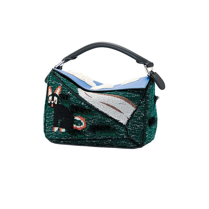 ウールとモヘアで仕立てた猫の編み柄やチネ草のロンググラス刺しゅうなど、随所に多彩な技法が駆使されています。バッグ“パズル スモール”[W24×H16.5×D10.5]¥649,000(Loewe/ロエベ ジャパン クライアントサービス) Hearst Owned