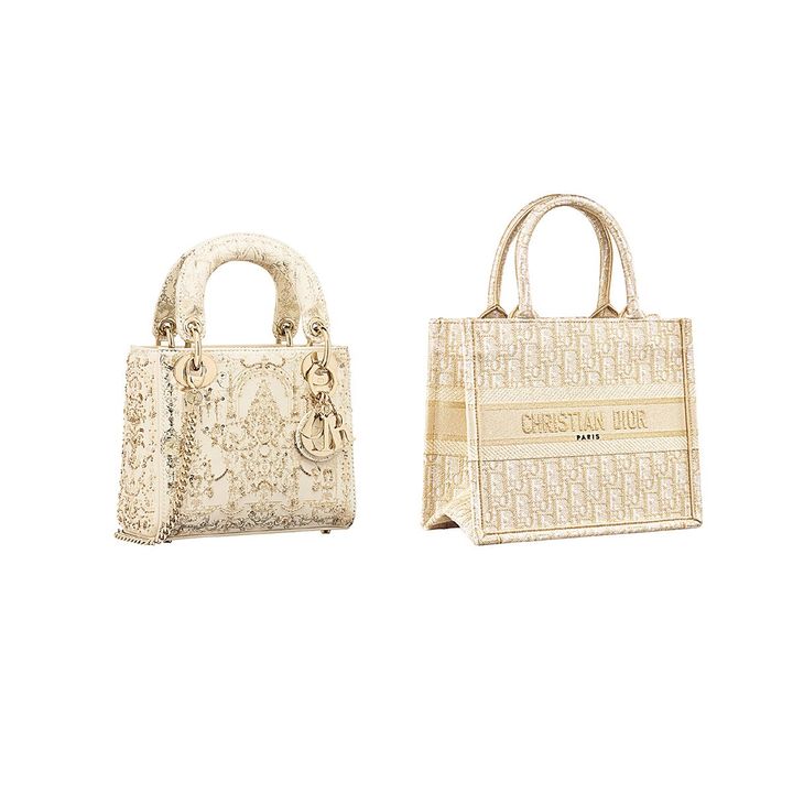 バロック様式に仕上げたアイコンアイテム。メタリックなレザーや糸を贅沢に用いることで、幻想的なきらめきを表現。バッグ〈右〉“ディオール ブックトート”[W26.5×H22×D14]¥930,000 〈左〉“レディ ディオール”[W17×H15×D7]¥1,100,000(2点共Dior/クリスチャン ディオール) Hearst Owned