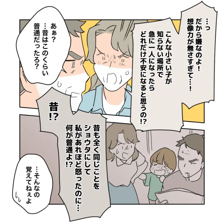 すると、義母の表情が一変。「だから嫌なのよ!想像力が無さすぎて・・!こんな小さい子が知らない場所で急に一人になったらどれだけ不安になると思うの!?」と責める義母に「あぁ?・・昔はこのくらい普通だったろ?」と不服そうに言う義父。「昔!?昔も全く同じことをショウタにして私があれほど怒ったのに・・何が普通よ!?」とさらに責められた義父は「・・そんなの覚えてねぇよ」と面倒くさそうに言いました。