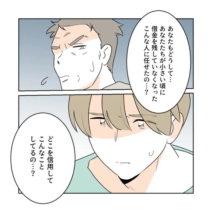 「あなたもどうして・・あなたたちが小さい頃に借金を残していなくなったこんな人に任せたの・・?どこを信用してこんなことしてるの・・?」と理解できないといった様子で聞きました。