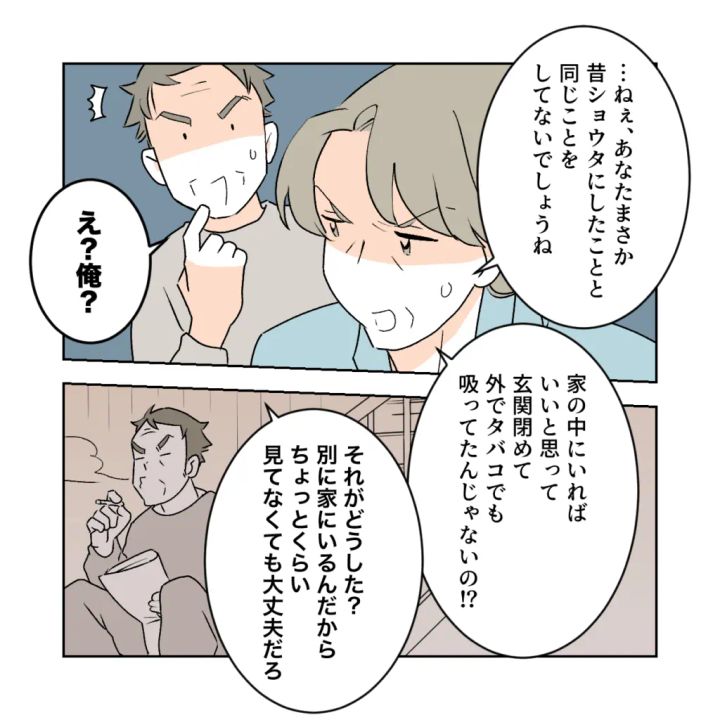 すると、私たちのやり取りを聞いていた義母が「・・ねぇ、あなたまさか昔ショウタにしたことと同じことをしてないでしょうね」と義父に言いました。話を振られた義父は「え?俺?」ときょとん。子どもが家の中にさえいれば良いという考えで、見ていないと危ないにもかかわらず自分だけ外に出て息抜きしていたではないかと義母が言うと、「それがどうした?別に家にいるんだからちょっとくらい見てなくても大丈夫だろ」と義母の予想通りのことをしていた義父が悪びれず言いました。