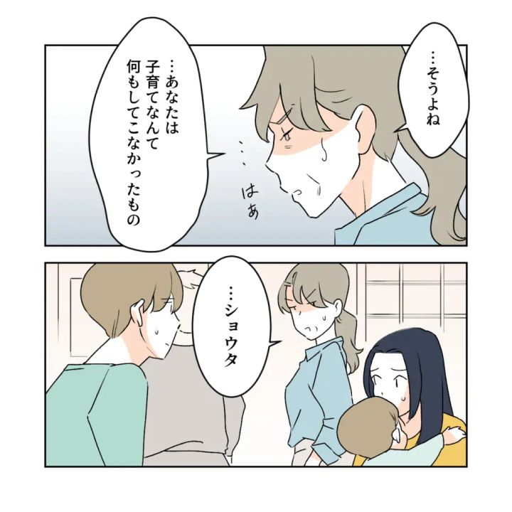 「・・そうよね。・・あなたは子育てなんて何もしてこなかったもの」と呆れたように呟いた義母は、「・・ショウタ」とショウタの方に向き直ると、
