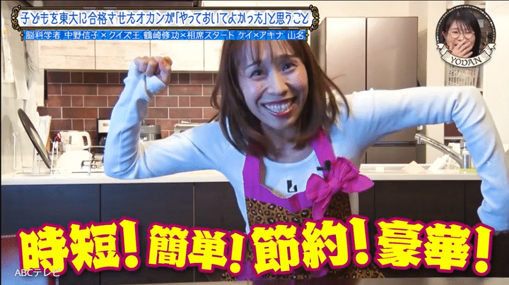 イケメン長男が現役東大生の料理研究家とは、「時短!簡単!節約!豪華!」をキャッチフレーズに斬新な料理やお弁当レシピを考案し、様々なメディアで活躍中のみきママのこと。次男も現在東大合格に向けて勉強中とのことで、親子の写真が紹介されると、かまいたち山内は「長男かっこいいな」、相席スタート山﨑ケイも「めちゃくちゃかっこいい」と声をあげた。