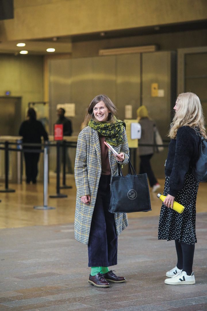 名門芸術大学〈セントラル・セント・マーチンズ〉でニットウエア専攻の講師を勤めるグッドレディ。自作のマフラー、チェック柄コート、コーデュロイのパンツ、グリーンソックス、柄も色も素材も自由に重ねてファッションを謳歌。