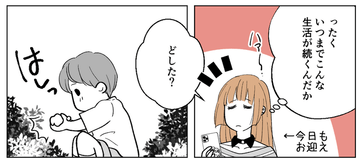 あれから、またしばらくの時間が過ぎました。週に何度も保育園のお迎えへ行く生活は変わりませんが、「いつかこの家を出て行く」と考えるようになってから、少しだけ気持ちは落ちついています。この日もいつものように甥っ子を迎えに行った帰り道、甥っ子が突然、道の端の草むらにしゃがみ込みました。