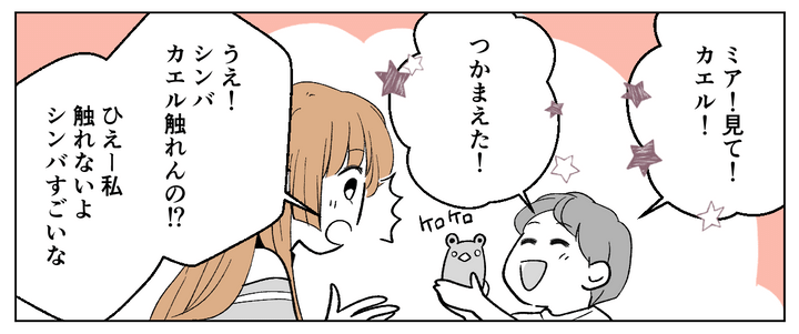 覗き込むと、甥っ子の手にはカエルが。私はカエルが苦手で触れないので、思わず「すごいな」と言いました。