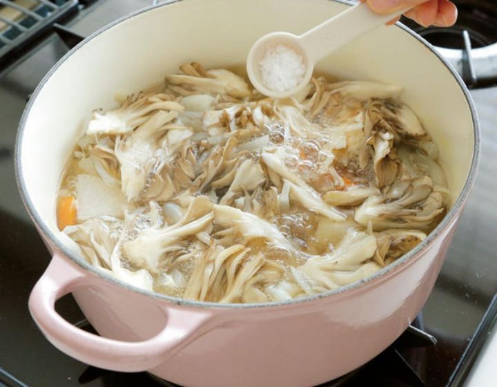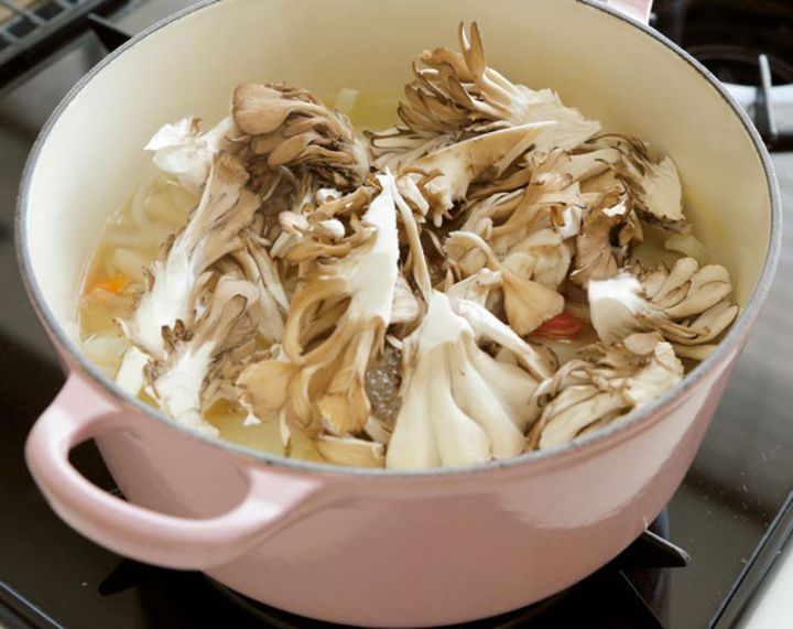 野菜がやわらかくなったらまいたけを加え、ひと煮する。途中、スープのかさが減ってきたら、適宜水を足す。