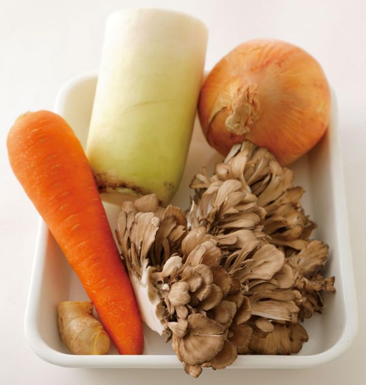 大根、にんじん、玉ねぎは皮をむいて食べやすい大きさに切る。にんじんは皮ごとでもよい。まいたけは石づきを落としてほぐす。