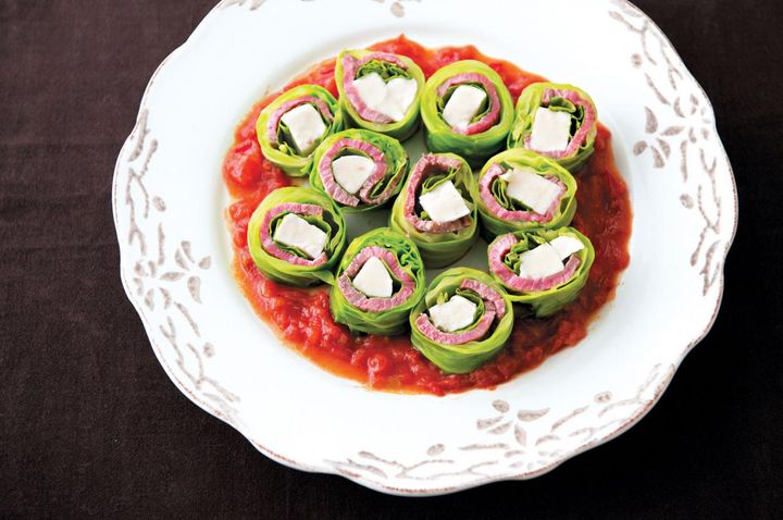 牛肉、チーズ、野菜の異なる歯ごたえと味わいが◎。簡単に作れるトマトソースは冷ましてから添えて。