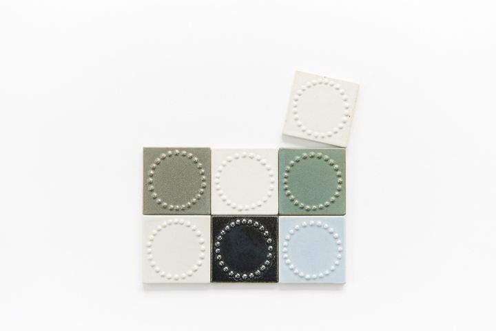 ふっくらとした「タンバリン」の模様がレリーフのように浮き立つタイルは白やパステルブルーなど優しい色合いの展開。一つをカトラリー置きとして活用したり、複数枚を使って壁一面に装飾を施したり。さまざまな使い方ができる。ミナ ペルホネン 盛岡のカフェmatkaでは、このタイルや、もう少し大きくて立体感のある「タンバリン」のタイルが店内にあしらわれている。