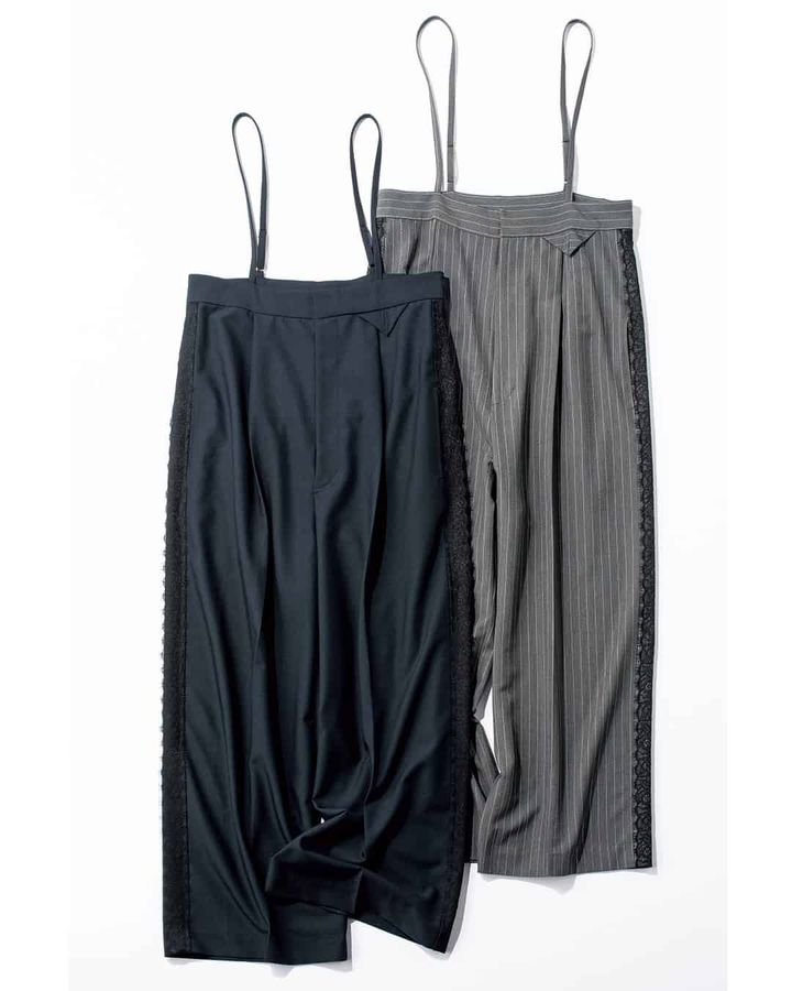 サイドのレースがラインパンツのようなデザイン。ウエストに施されたコインポケットはメンズライクな印象を引き立てます。グレーのみストライプデザイン。自宅で洗濯ができるので、デイリーコーデに役立ちます。