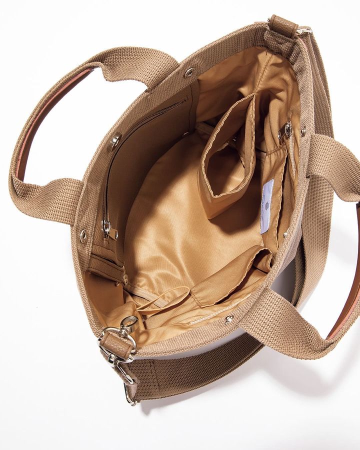 ラージサイズは仕事やオケージョンのサブバッグとして、ミニサイズはメインバッグとして活躍。取手にはブラックの厚手パイピングがアクセントに。ラージサイズには大きめの内ポケットもあり。