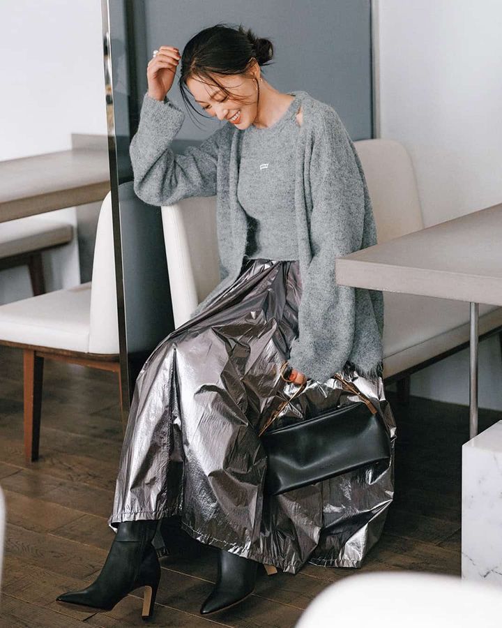 ニットアンサンブル¥5,940(モカ)ピアス¥14,850(アフェクト)スカート¥28,500(シーニュ)バッグ¥75,900(マエストソ/アマン)ブーツ¥44,000(ダイアナ/ダイアナ銀座本店)リング¥19,800(yuma/ロードス)