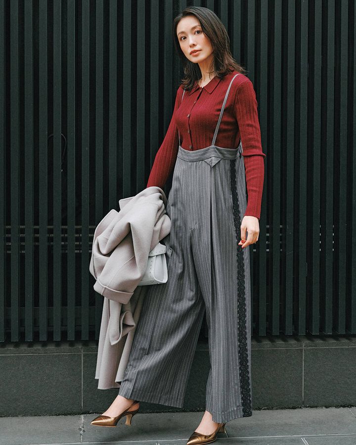 サロペット¥18,480(ミュール)ニット¥38,500(デパリエ/デパリエ 伊勢丹新宿店)コート¥57,200(アルページュストーリー/アルページュストーリー プレスルーム)バッグ¥15,950パンプス¥17,600(ともにダイアナ/ダイアナ 銀座本店)