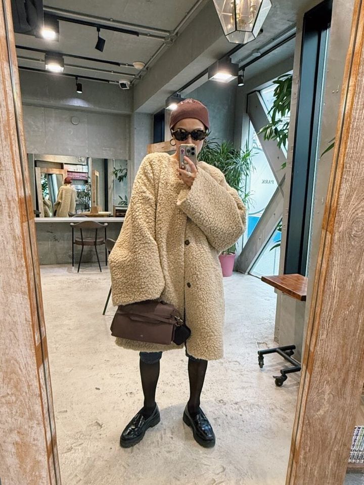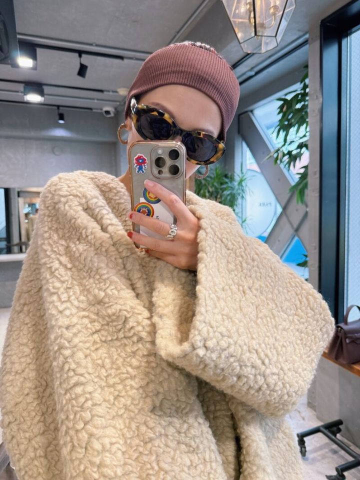 「この冬大本命のファーコートを使って早速スタイリング♪ ボリュームのある1枚なので、足元とヘアはスッキリさせたのが着こなしのポイント。コートは白系、ヘアバンドやバッグを茶系を選んで統一感を意識しました。シューズはクラネ×ジーエイチバスのローファーで、シックな雰囲気に」(ヘアサロンPARKオーナー・水戸怜子さん)