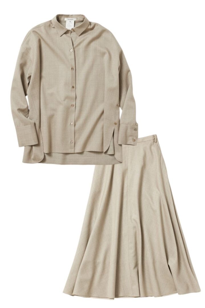 きれいめのシャツとエレガントなフレアスカートの組み合わせ。それぞれ単品でも着られるので活躍間違いなし! シャツ¥27,500、スカート¥29,700/ともにマルモア(DMC)※シャツのみ