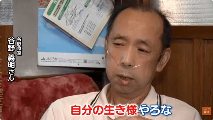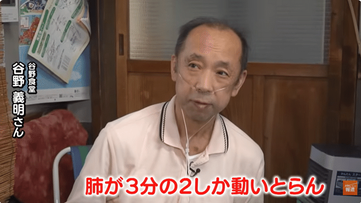 ところが義明さんは1年ほど前、肺が徐々に硬くなり、呼吸機能が低下する難病「突発性間質性肺炎」を発病。肺の3分の1ほどが機能していないため、24時間酸素吸入が必要です。特効薬はなく、医師には「ともかく、じっとしとくこと」と安静を指示されましたが、厨房に立ち続けています。