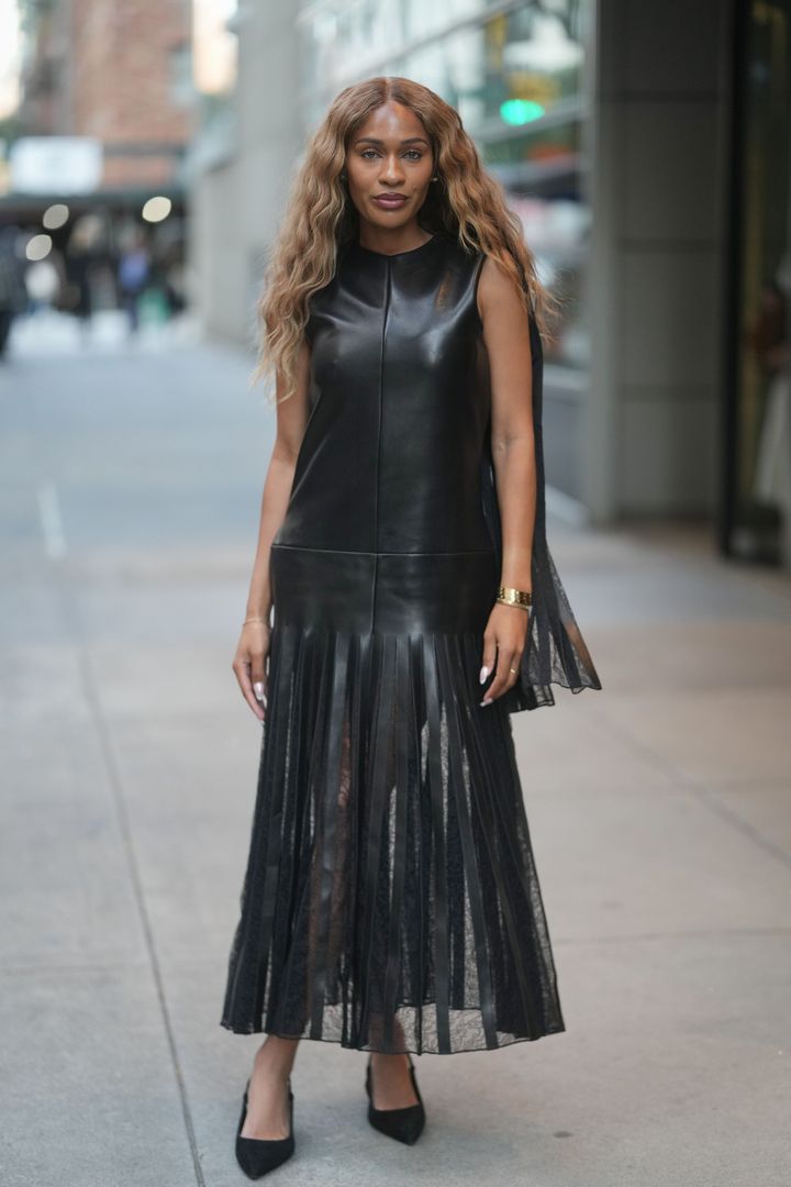 来シーズン、ピエールパオロ・ピッチョーリ率いる新生バレンシアガBALENCIAGA)やジバンシィGIVENCHY)などからは、ブラックを主役にしたドレスが多数登場。中でも、艶感のあるレザー素材で魅せるスタイルが注目を集めそうだ。ノースリーブのブラックレザーワンピースを纏ったスナップの女性は、クールなドレスルックを披露。腰から流れるプリーツのようなデザインが動きにリズムを与え、シンプルながらもドラマティックな印象を演出している。さらに、アクセサリーは最小限に抑え、ワンピースを主役として際立たせているのもポイント。華美に見せるのではなく、質感とシルエットで魅せることで、ブラックレザーならではのモード感が際立つ。来シーズンを匂わせる先取りの装いとして、パーティーシーンでも周囲と差をつける一着だ。