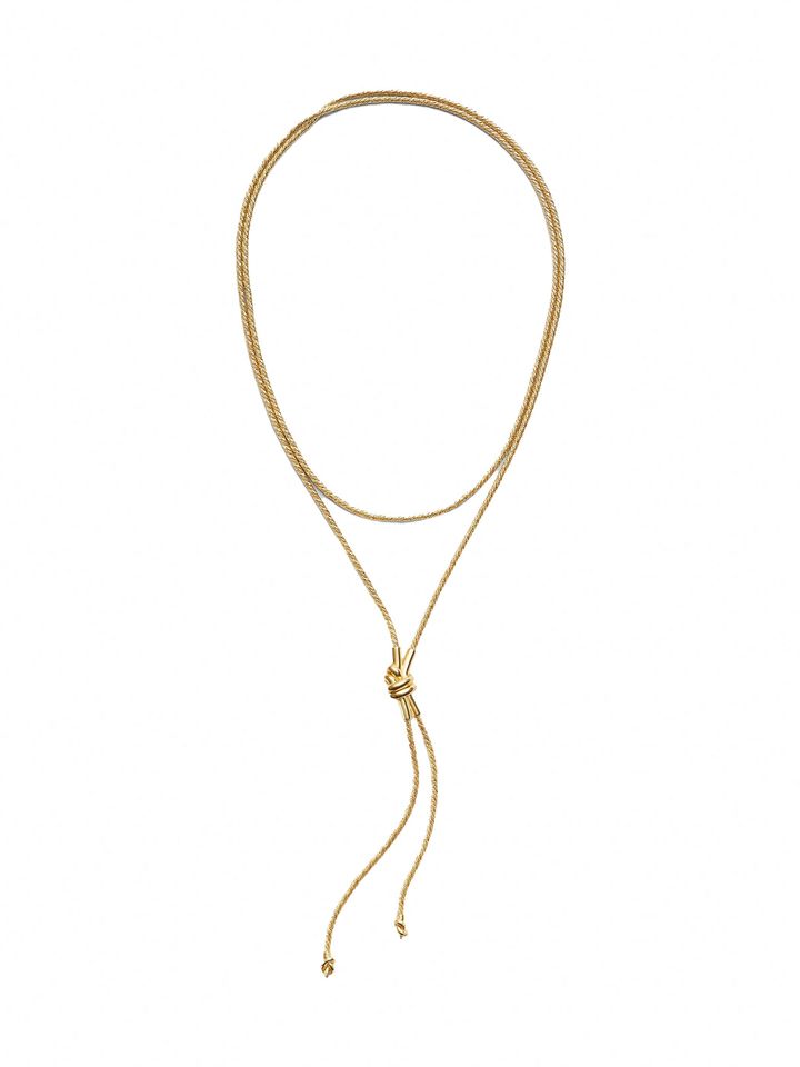 胸もとに輝くノットデザインは“結び目”を意味し、「絆」「縁」「愛」といった想いを宿すロマンティックなネックレス。イエローゴールドの光沢が首もとに華やぎを添え、控えめな存在感でシンプルな装いにも自然にモード感をプラス。季節やシーンを問わず、日々のスタイルに静かな洗練をもたらしてくれる一品。