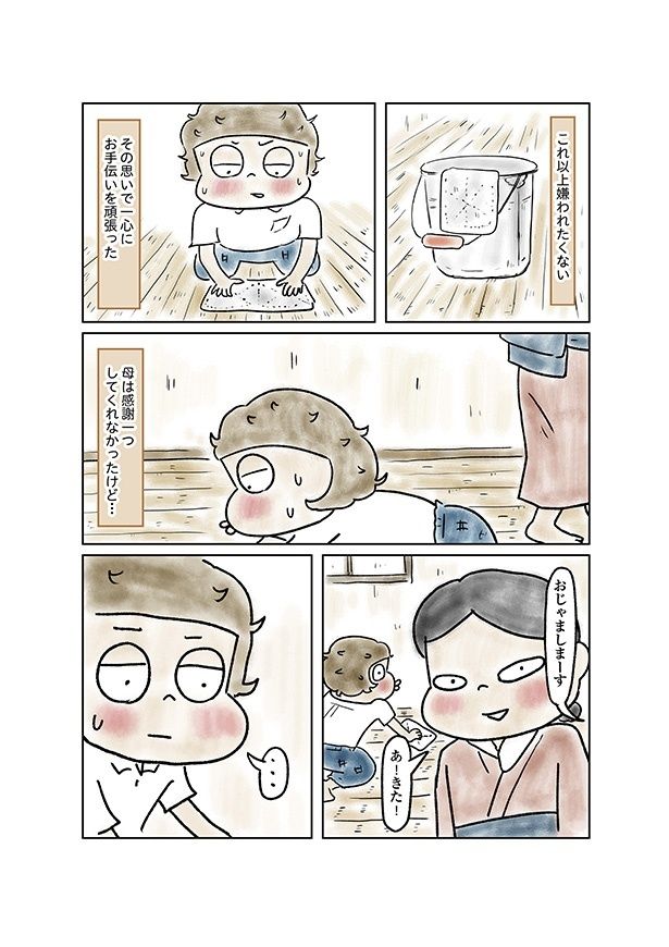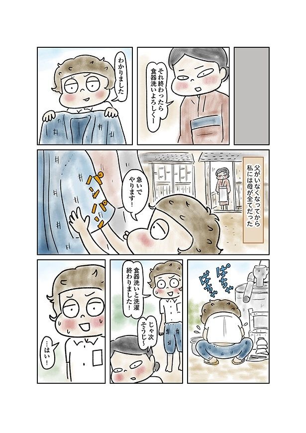 今回は、忍者ママさんの母「えっちゃん」の幼少期について。戦争に行った父の訃報が届き、母親がすべてになったえっちゃんさん。「お母さんに嫌われたくない」の一心でお手伝いを頑張るが、ある時から2人だけの家に知らないおじさんが出入りするようになる…。