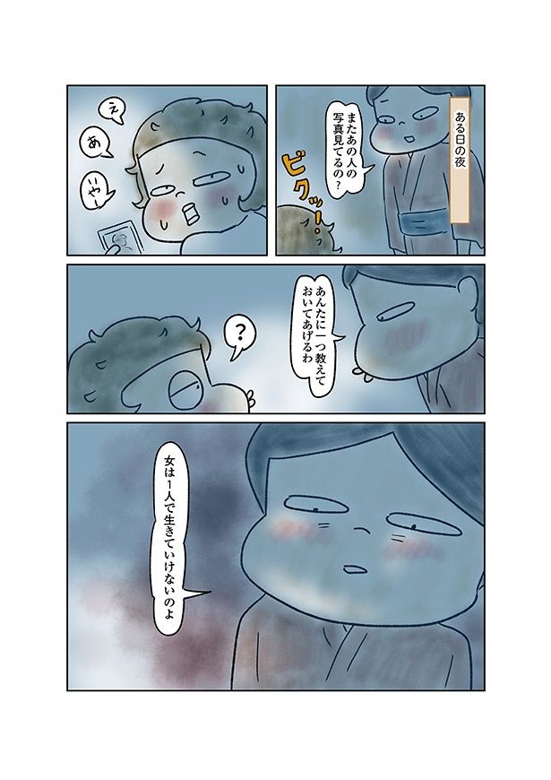 家に出入りするおじさんが好きになれず、優しかったお父さんが忘れられないえっちゃんさん。こっそり写真を見ている彼女にお母さんが言い放つ「女は一人では生きていけないのよ」というセリフが、とても印象深い。忍者ママさんから見てこの言葉は、えっちゃんさんの生き方に何かしら影響を及ぼしているのだろうか?