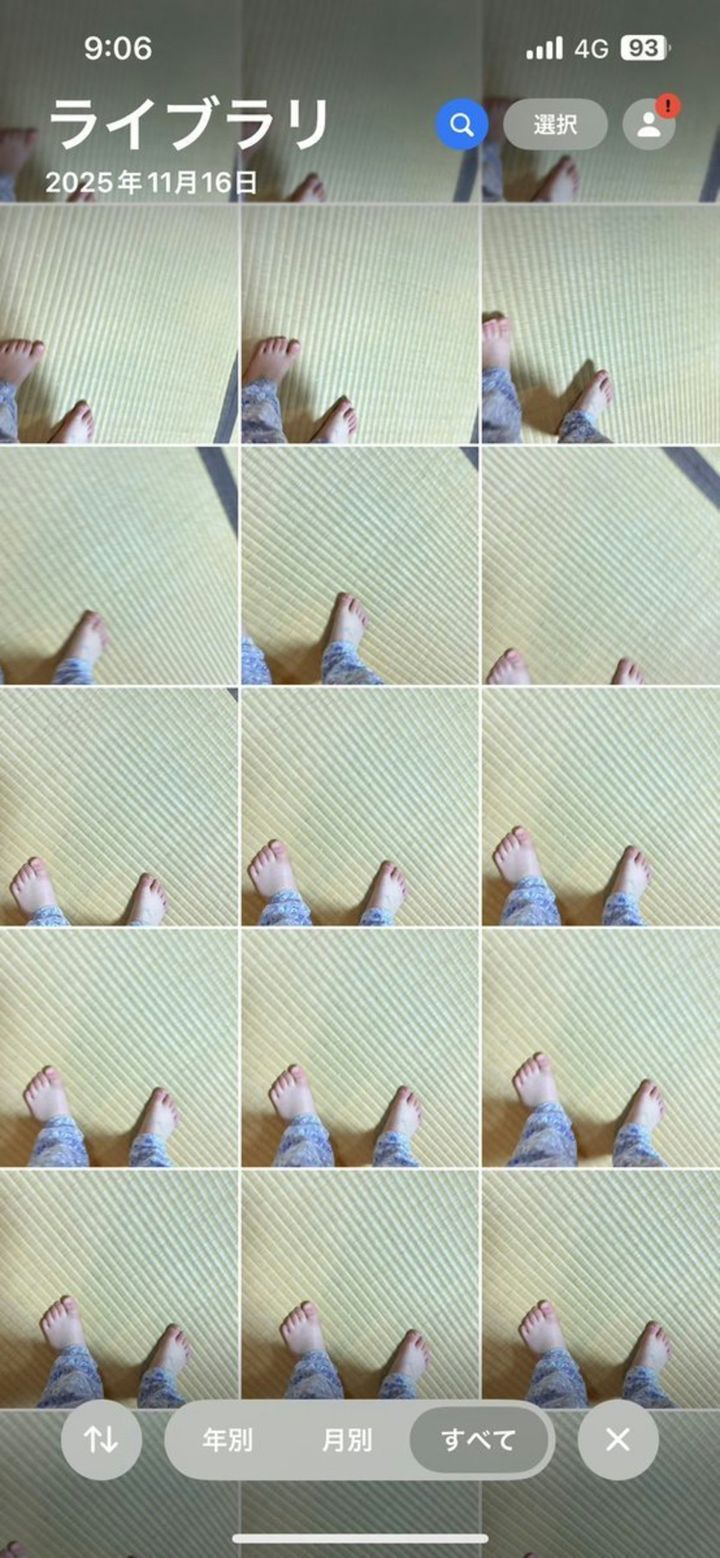 全部、「足」。かわいい2歳さんの足がずらり。並べるとむしろ作品感すら漂います。小さい子どもって、シャッター音が鳴るのがうれしいのか、撮れてるという事実にテンションが上がるのか…ひたすら連写したりしますよね。ただの足の写真でも、なんかかわいくて消せなかったりします。