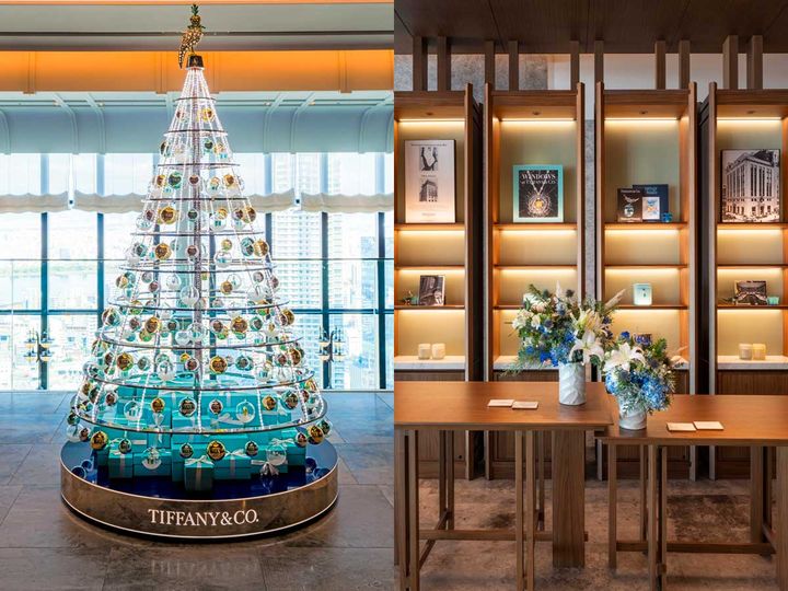 〈左〉“ティファニーブルー”に輝くクリスマスツリーの下にはギフトボックスの山。まさに夢の光景!〈右〉ふたつのブランドのレガシーを体感できるディスプレイ。 Waldorf Astoria Osaka