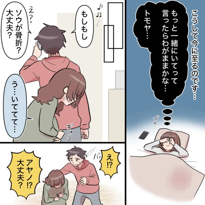 初めての妊娠なのに近くに頼れる人がいない状況は、私の心に大きな不安と寂しさを残しました。それからしばらくして、私は臨月を迎えました。ある日、自宅でゆっくり過ごしていると、トモヤのスマホに義実家から電話がかかってきました。どうやらソウくんが骨折したようです。その瞬間、お腹に痛みが走りました。「いててて・・・」と声を漏らす私に気付いたトモヤが「アヤノ、大丈夫!?」と慌てて駆け寄ってきます。