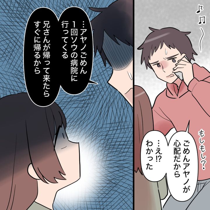 トモヤの言葉にホッとしたのもつかの間、またスマホが鳴りました。「ごめんアヤノが心配だから・・・え!?わかった」慌てて電話を切ったトモヤは、「ごめん、1回ソウの病院に行ってくる、兄さんが帰ってきたらすぐに帰るから」と申し訳なさそうに言いました。