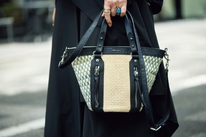 バッグは「ディーゼル」。「長年愛用しているかごバッグはところどころにデニムがあしらわれ、程よいカジュアル感をプラス」