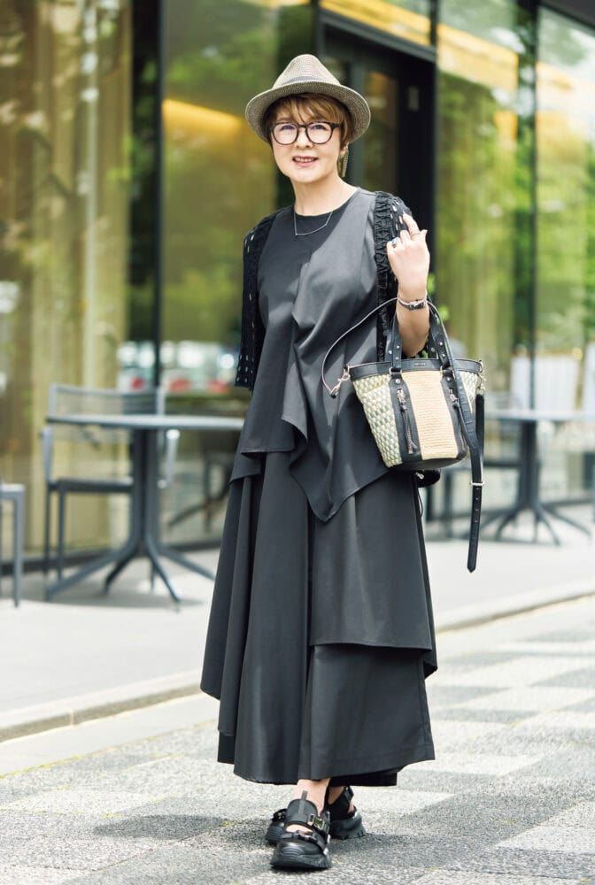 【60代お手本スナップ・京都】ブラックコーデを軽やかに!構築的なデザインでワントーンコーデのおしゃれを底上げ!