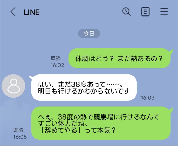 『へぇ、38度の熱で競馬場に行けるなんてすごい体力だね。「辞めてやる」って本気?』